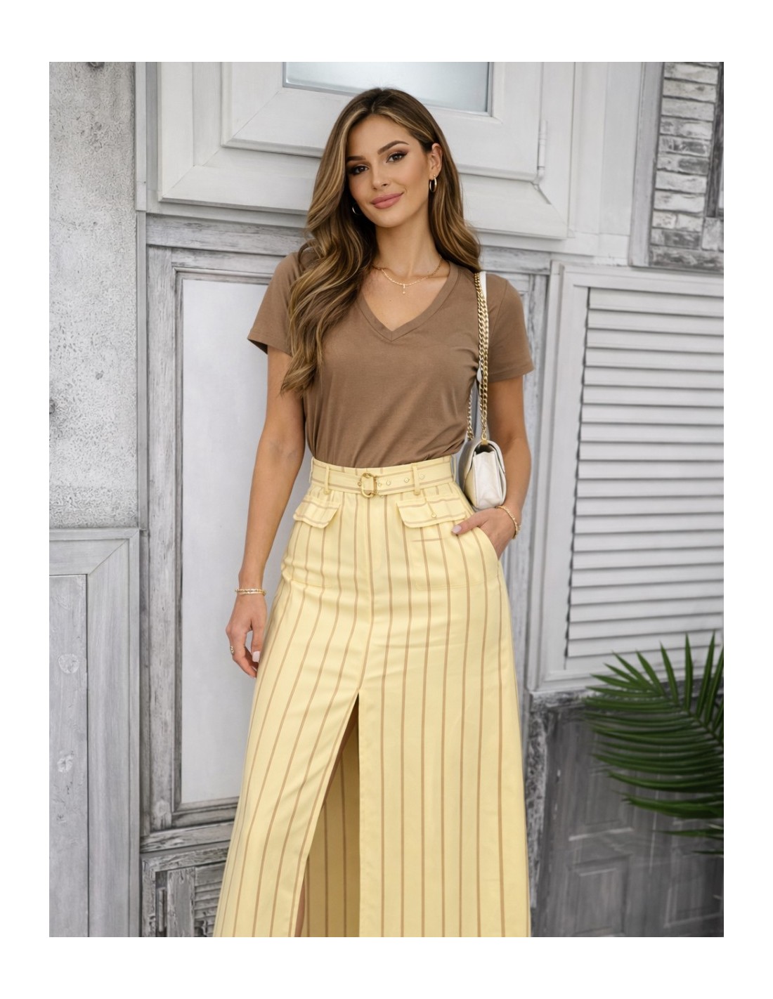 Falda larga para mujer en color amarillo suave con elegante diseño de rayas verticales que estiliza la figura. Cuenta con cintura alta con cinturón ajustable, prácticos bolsillos y una sofisticada abertura frontal que aporta movimiento y comodidad. Su estilo moderno y femenino la convierte en una prenda perfecta para looks casuales, de oficina o para ocasiones especiales durante primavera y verano. Combínala fácilmente con camisetas, blusas o tops para crear outfits frescos y elegantes.
