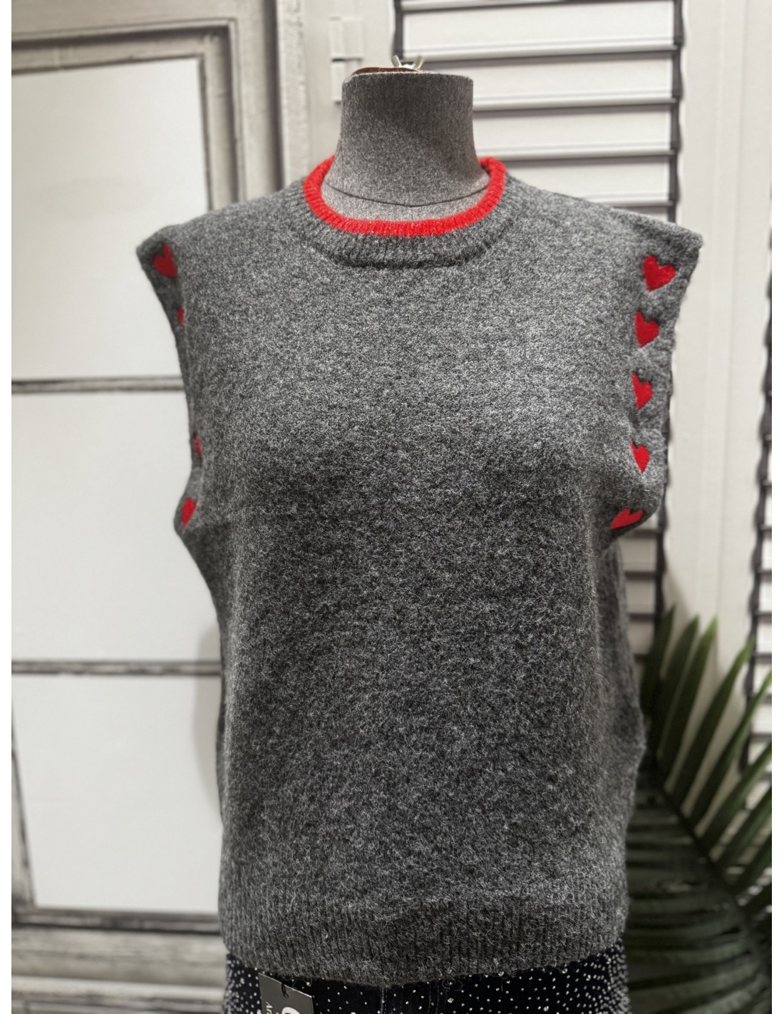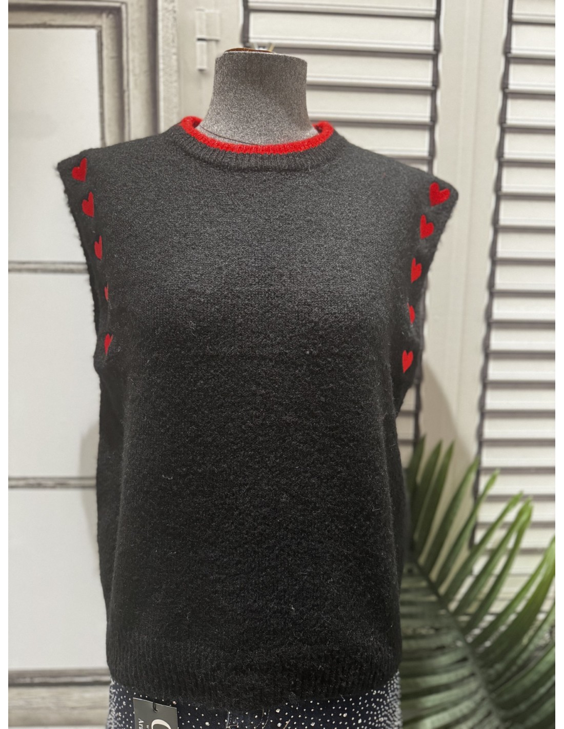 Chaleco de lana con corazones rojos en la sisa