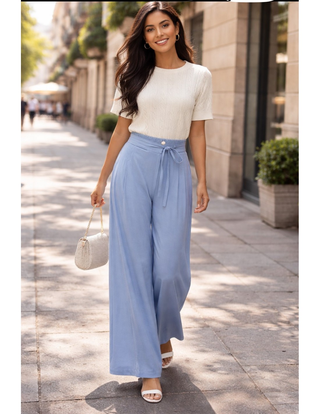 Pantalón fluido de pernera ancha en tono azul, con cintura elástica y detalle de lazada ajustable. Su diseño ligero y cómodo lo convierte en la opción perfecta para el día a día o para looks más elegantes. Fácil de combinar con camisetas, blusas o prendas de punto, aporta estilo y movimiento.