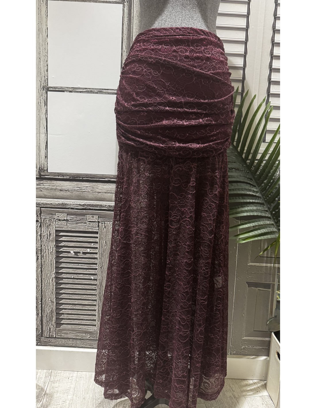 Falda de mujer confeccionada en delicado encaje, con diseño largo y elegante. La parte superior presenta un drapeado que realza la silueta, aportando un toque sofisticado y femenino. Una prenda versátil y distinguida, ideal para ocasiones especiales o para combinar en looks elegantes y modernos.